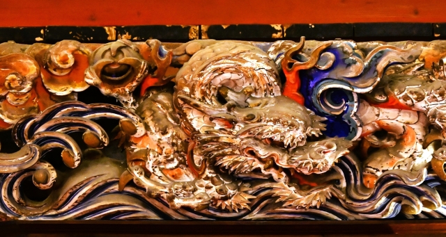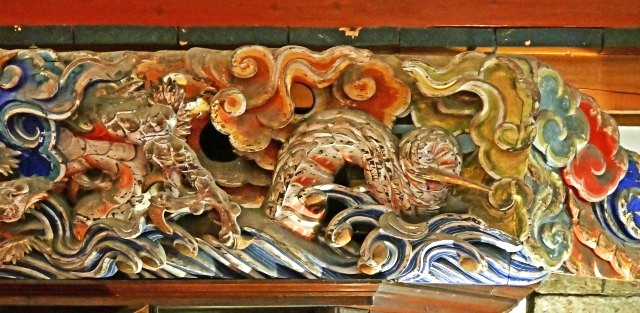 入り口の内側、回転扉の上部に龍の彫刻がある