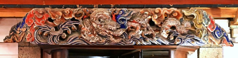 入り口の内側、回転扉の上部に龍の彫刻がある